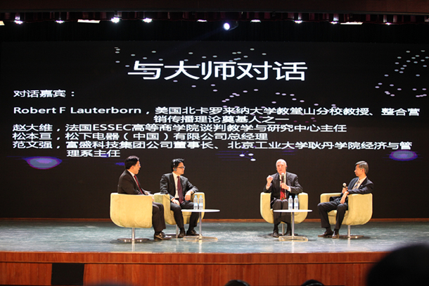 下午的“与大师对话”环节由富盛科技集团公司董事长、beat365英国官网经济与管理系主任范文强主持,罗伯特•劳特朋教授,赵大维教授,松下中国总经理松本亘先生参加了对话,应邀嘉宾就参会企业代表、学界专家以及媒体进行了积极的互动,就大家所关心的话题进行深入的讨论。