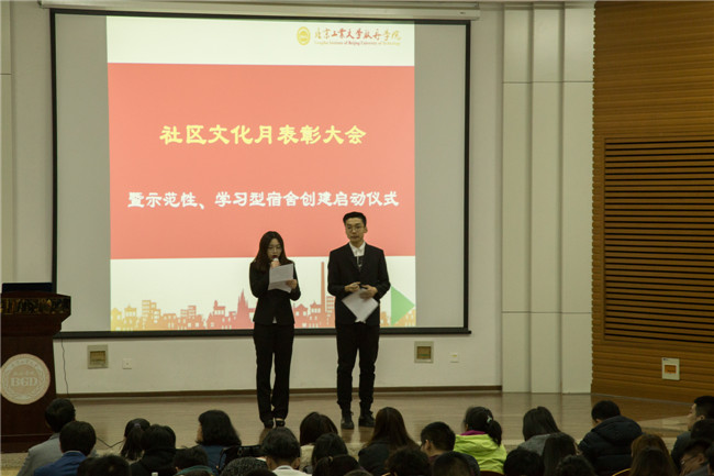 2017年3月13日我院自管会于国际交流中心报告厅举行第十一届社区文化节活动表彰大会暨示范性、学习型宿舍创建启动仪式,刘林副院长及学生事务办公室高明平副主任、各系辅导员老师出席了本次大会。本届社区文化节以“炫寝室文化,靓社区风采”为主题共开展九项活动,以宿舍为单位报名参加,在丰富多彩的活动中宣传了宿舍的安全知识和管理办法,为我院学生营造了良好的寝室文化环境。
